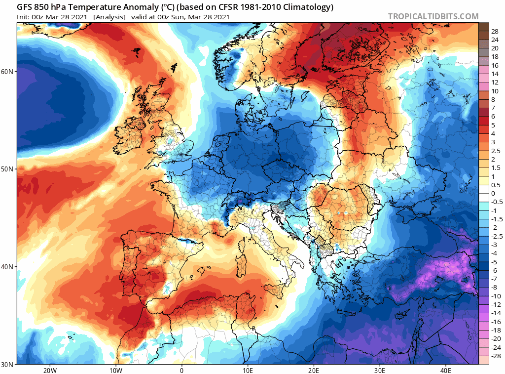Avec des températures comprises entre 10 et 12°C - voire 14°C au sud-ouest - à 850 hPa (vers 1500m) et un franc soleil en toutes régions, les températures se sont rapidement envolées durant les dernières journées du mois de mars 2021. L'anomalie de la masse d'air ci-dessus met en évidence des valeurs 8 à 12 degrés au dessus des valeurs de saison sur l'ensemble de la France !
