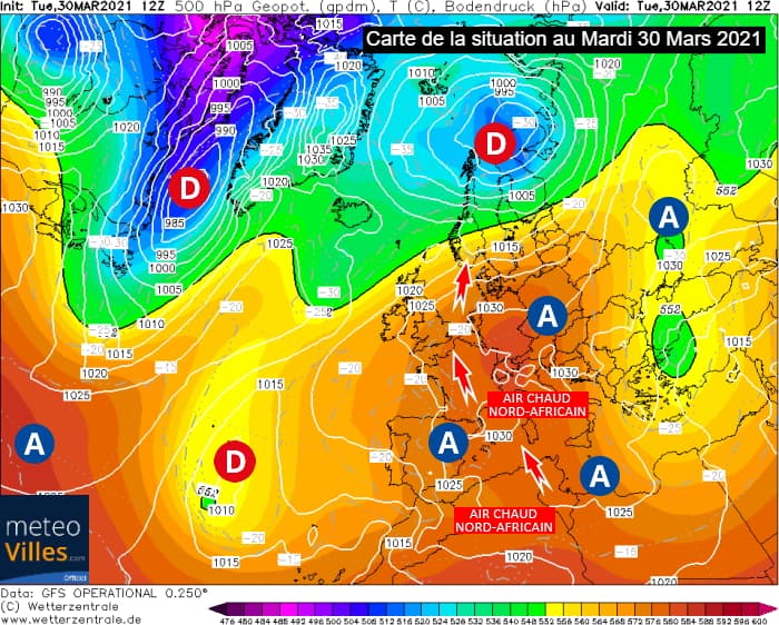 En cette fin mars 2021, un puissant anticyclone est venu se centrer entre le bassin méditerranéen et l'Europe Centrale, tandis que les dépressions étaient rejetées sur le nord de l'Atlantique. On notait également la présence d'une anomalie dépressionnaire vers les Açores. Cette configuration a contribué à la mise en place d'un flux de secteur sud à sud-est, persistant durant plusieurs jours sur la France et faisant remonter de l'air en provenance du nord de l'Afrique !