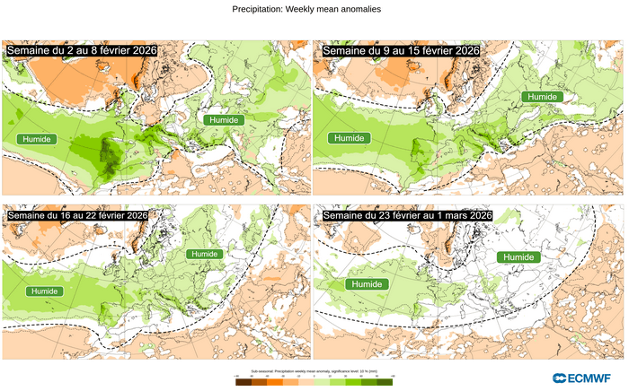Même si cela peut sembler surprenant et même assez inquiétant, aucune véritable amélioration n'est envisagée durant le mois de février par les modèles de prévision à long terme. Les anomalies de précipitations hebdomadaires restent en effet positives jusqu'au début du mois de mars sur notre pays, ce qui induit la persistance d'un temps très humide et perturbé durant possiblement un mois à minima.