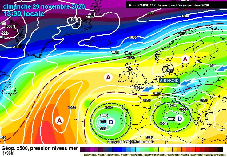 Cette goutte froide va ensuite migrer vers l'Italie d'ici le week-end des 28 et 29 novembre 2020, apportant de l'agitation jusque sur nos régions méditerranéennes. Dans le même temps, un nouveau talweg plongera sur le proche-Atlantique et causera l'isolement d'une nouvelle goutte froide au large du Portugal d'ici dimanche.