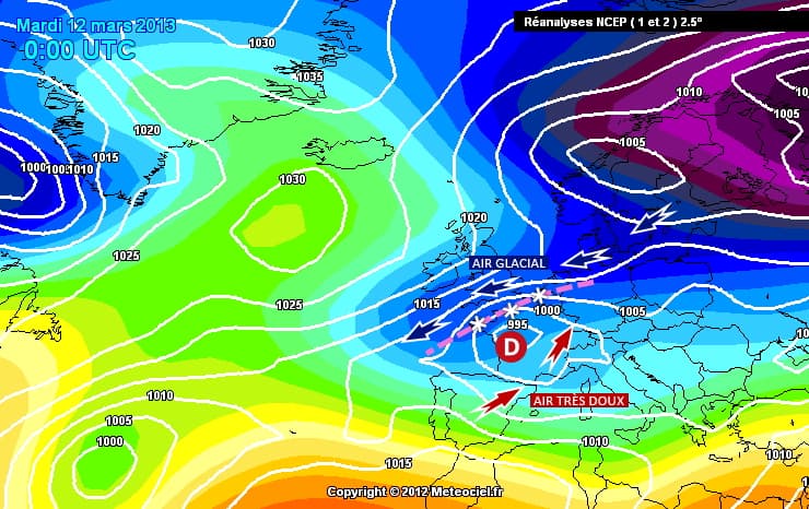 Une dépression s'est alors creusée au large de nos côtes atlantiques avant d'enfoncer très lentement sur la France durant les journées des lundi 11 et mardi 12 mars 2013. Avec un coeur dépressionnaire positionné sur le centre de l'hexagone, le sud baignait dans la douceur tandis que les régions du nord ont basculé dans l'air glacial sous l'influence de l'air continental. La zone neigeuse s'est formée au niveau de la zone de conflit.