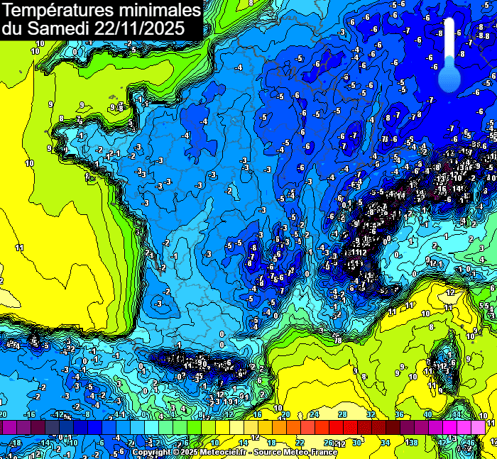 Températures minimales modélisées le samedi 22 novembre 2025 - meteociel.fr
