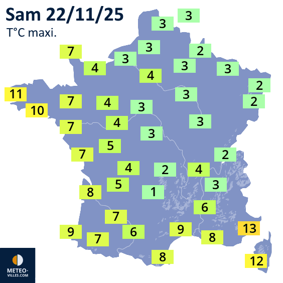 Les températures de l'après-midi vont se maintenir à des niveaux véritablement hivernaux. Dans le nord, le centre et l'est de la France, elles plafonneront la plupart du temps entre 2 et 4°C, des valeurs inférieures aux normales d'un mois de janvier et très largement sous celles d'une dernière décade de novembre. Il fera quelques degrés de plus vers l'océan et la Méditerranée. La combinaison d'un gel nocturne généralisé et d'une journée froide devrait faire de ce samedi la journée de novembre la plus froide en France depuis 12 ans, soit depuis novembre 2013 !