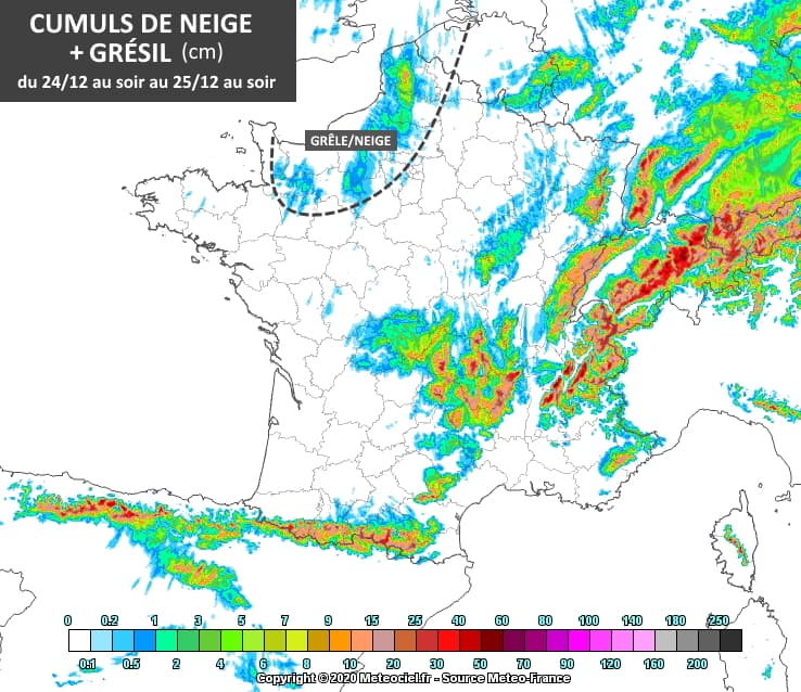 Cumuls de neige et de grésil/neige roulée du 24 décembre au soir au 25 décembre 2020 au soir - via meteociel.fr