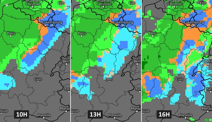 Nature des précipitations le dimanche 27 décembre 2020 (vert = pluie, orange = pluie/neige, bleu = neige) - via meteologix