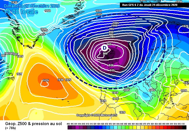 Une vaste dépression présente aux hautes latitudes va plonger sur les Îles Britanniques en journée du dimanche 27 décembre 2020. Les pressions pourraient s'abaisser autour de 960 hPa en son centre, des valeurs impressionnantes ! Cette dépression apportera une forte dégradation sur la France, se traduisant par l'arrivée d'une perturbation océanique très active.