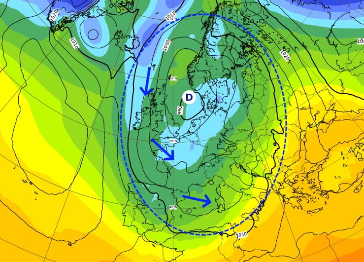 La dépression responsable du très mauvais temps attendu ce dimanche va stagner en Mer du Nord durant les derniers jours de l'année. Celle-ci se chargera de maintenir un flux de nord-ouest modérément froid sur la France mais également d'entretenir les conditions instables avec plusieurs passages perturbés en provenance des Îles Britanniques et de l'Atlantique.