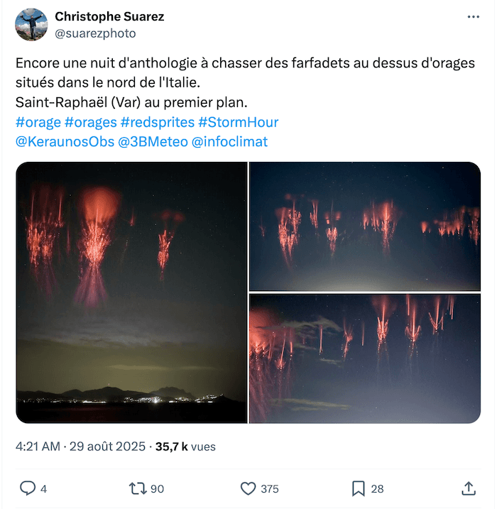 De nombreux phénomènes lumineux transitoires ont été observés depuis le Sud-est de la France dans la nuit de jeudi à vendredi. Ces phénomènes sont liés à des orages qui éclataient en Italie !