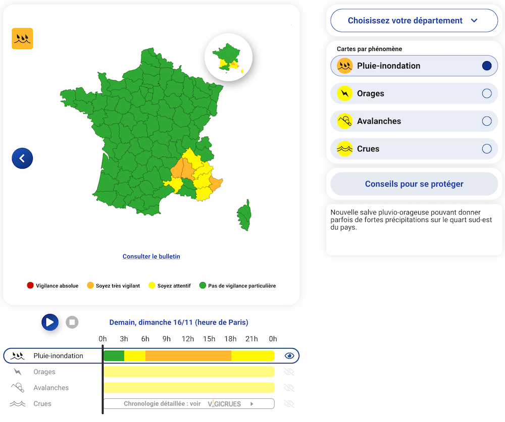 Compte tenu de la saturation des sols suite aux récentes précipitations abondantes, il est possible que certains cours d’eau présentent une réaction plus prononcée que samedi, notamment dans l’arrière-pays niçois et sur les Cévennes. Par conséquent, plusieurs départements sont placés en vigilance jaune ou orange.