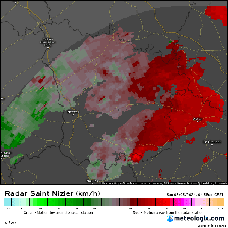 Image doppler de la Nièvre à 16h55 - le dipôle se trouve au Sud du département - Meteologix