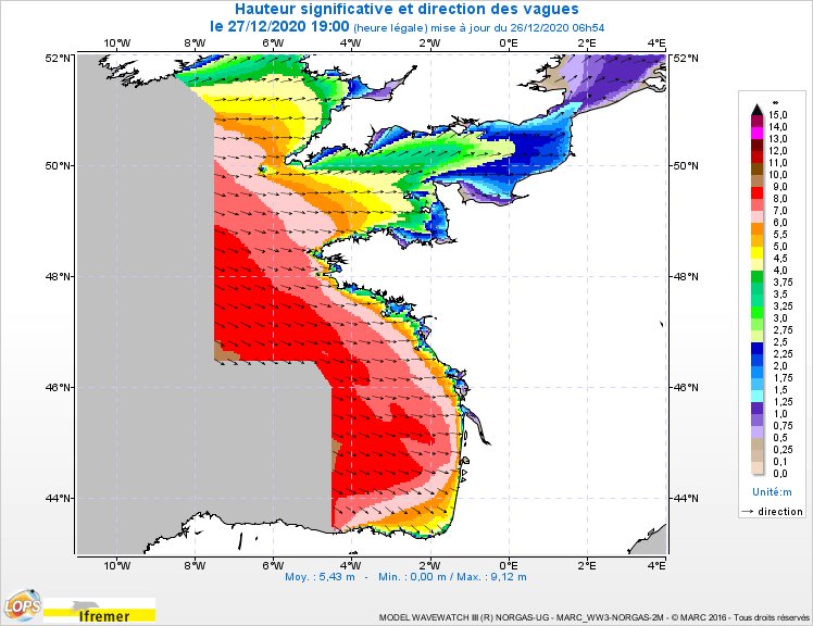 Hauteur maximale prévue de la houle - soirée du dimanche 27 décembre 2020 - Ifremer