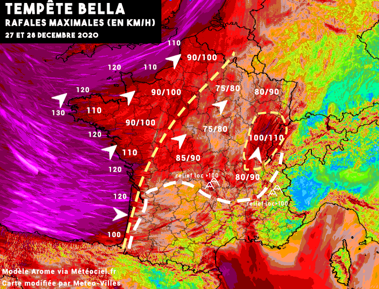 Tempête Bella - rafales maximales prévues les 27 et 28 décembre 2020 - Modèle Arome via Meteociel