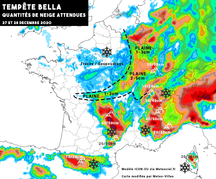 Quantités de neige attendues - dimanche 27 et lundi 28 décembre 2020 - Modèle ICON-EU via meteociel