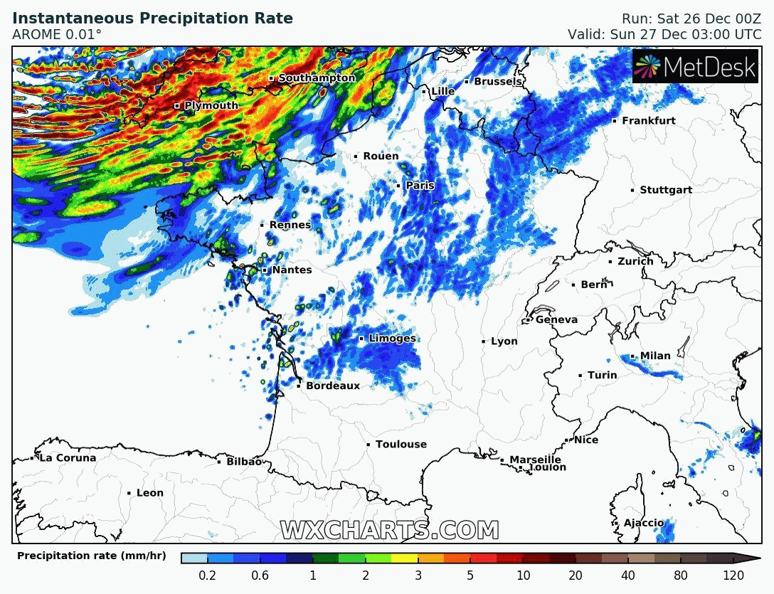 Précipitations attendues - journée du dimanche 27 décembre 2020 - Modèle Arome via WxCharts