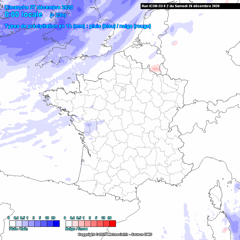 Précipitations (pluie et neige) attendues les 27 et 28 décembre 2020 - Modèle ICON-EU via Meteociel