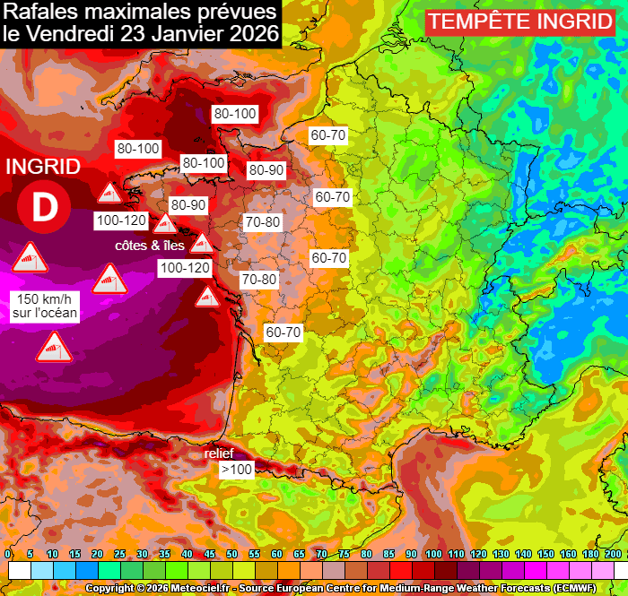 Rafales maximales prévues le vendredi 23 janvier 2026 (tempête Ingrid) - meteociel.fr