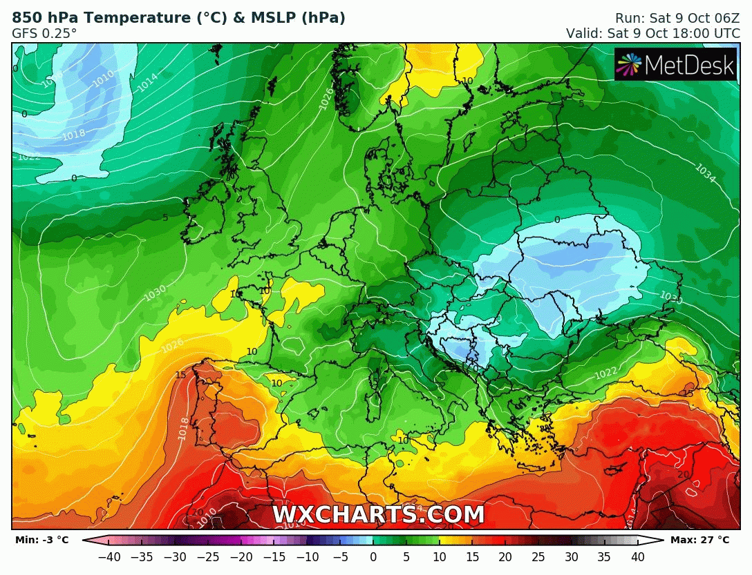 Animation des températures à 850hPa sur l'Ouest de l'Europe du samedi 9 au mercredi 13 octobre 2021 – Modèle GFS via WX CHARTS