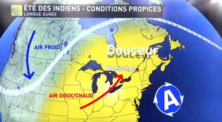 Cette situation se présente sur ces régions lorsqu'un anticyclone s'installe plus ou moins durablement à l'avant d'une zone dépressionnaire et que le flux bascule au Sud-Ouest en altitude, faisant remonter de l'air doux voire assez chaud jusqu'au Canada au beau milieu de l'automne alors que des coups de froid ont déjà été observés auparavant.