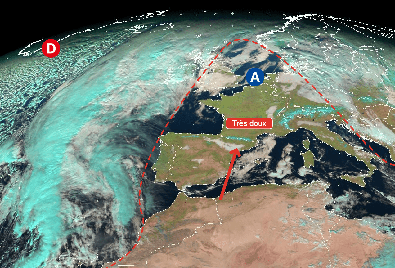 Néanmoins, pas de flux de Sud/Sud-Ouest en altitude et plutôt un flux de Nord/Nord-Est amenant de l'air assez frais directement du Nord de l'Europe et de la Russie vers la France.