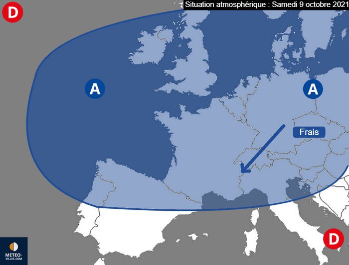 Schéma de la situation atmosphérique ce samedi 9 octobre 2021 sur l'Ouest de l'Europe – ECMWF, modifié par Météo-Villes