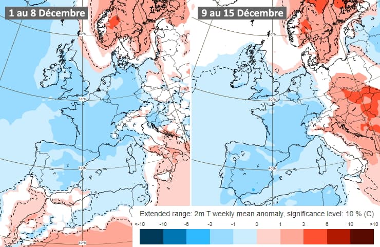 Avec la persistance d'anomalies dépressionnaires à proximité immédiate de notre pays, l'ensemble des scénarios s'accordent sur des températures inférieures aux normales de saison au cours des deux prochaines semaines. Le scénario du modèle européen ci-dessus montre des anomalies thermiques de -1 à -3°C en France tout au long de la première quinzaine de ce mois de décembre 2020.