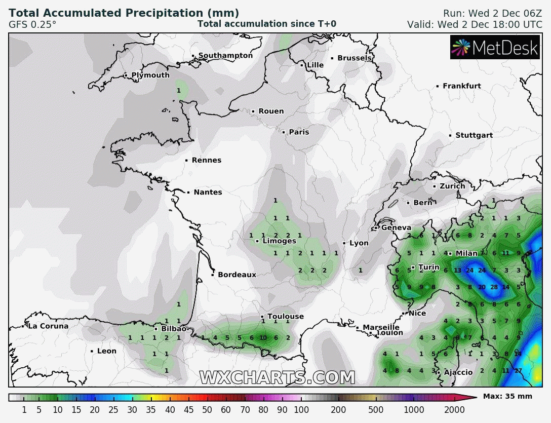 Modélisation des cumuls de précipitations jusqu'au 10 décembre 2020 - via wxcharts.com