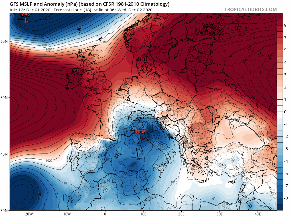 Pressions (basses en bleu, hautes en rouge) du 2 au 10 décembre 2020 - via tropicaltidbits.com