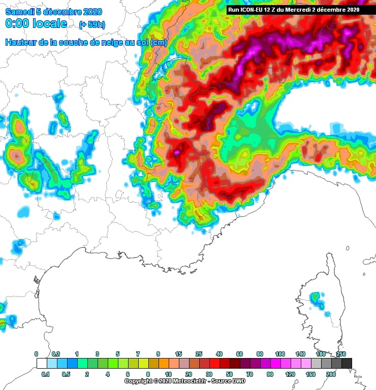 Cumuls de neige attendus sur la journée du vendredi 4 décembre 2020 - modèle ICON via meteociel.fr