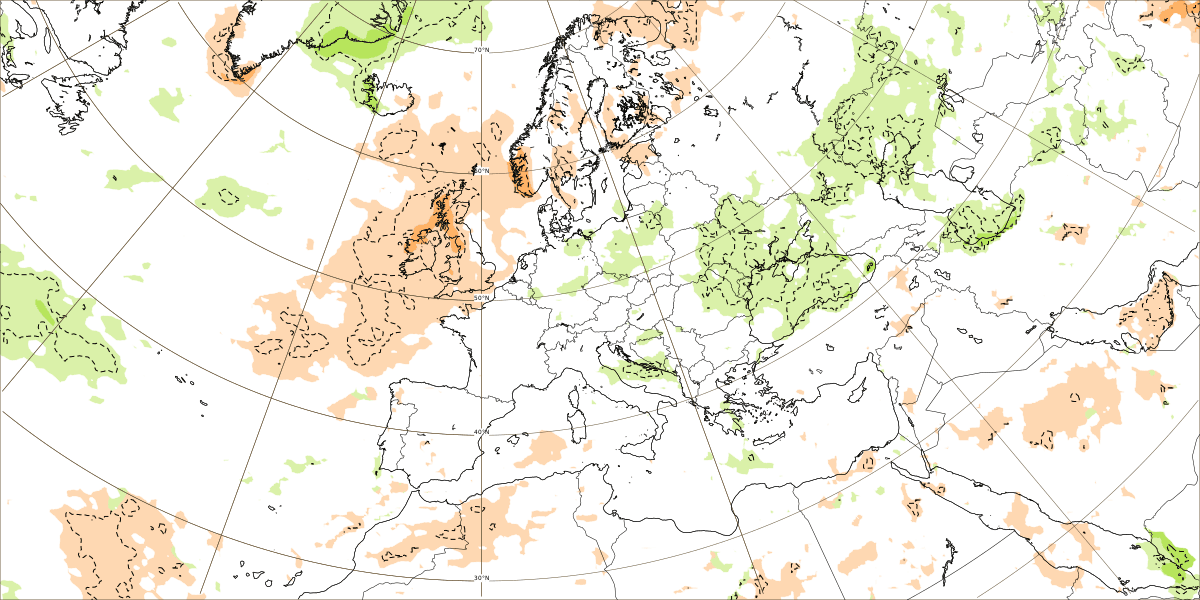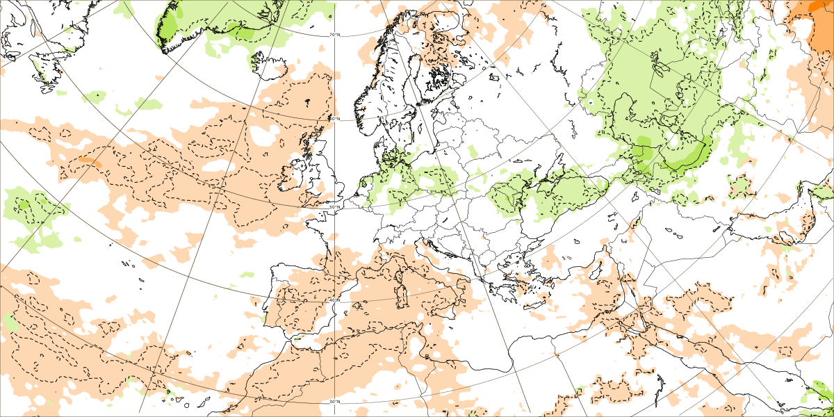 Au niveau des précipitations, nous ne retrouvons pas vraiment d'anomalie positive sur le pays, ce qui laisserait entrevoir un flux océanique plutôt mou, majoritairement nuageux avec de temps à autre des averses, surtout au Nord. Plus au Sud, le risque de précipitation pourrait s'avérer plus faible mais l'air plus frais circulant en altitude serait favorable à des développements nuageux plus ou moins importants selon les jours, notamment près des reliefs.