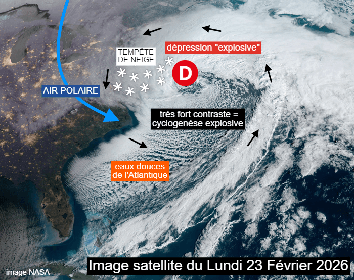 Des tempêtes de neige de la dimension de celle qui vient de toucher le nord-est des USA ne sont pas véritablement possibles en France et ce pour des raisons géographiques. En effet, lorsque l'air polaire descend sur le nord-est des États-Unis, il atteint l'océan Atlantique sans avoir rencontré de mer. Ainsi, il est encore particulièrement froid. Cet air glacial crée un gros contraste thermique avec les eaux douces de l'Atlantique, ce qui peut générer une cyclogenèse explosive au dessus de l'océan avec des dépressions se creusant très rapidement et générant des tempêtes de neige de forte intensité sur la côte est américaine, comme ce fut le cas ce lundi 23 février 2026.