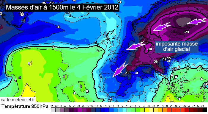 Masses d’air à 850 hPa (vers 1500m) le 5 février 2012 – via meteociel.fr