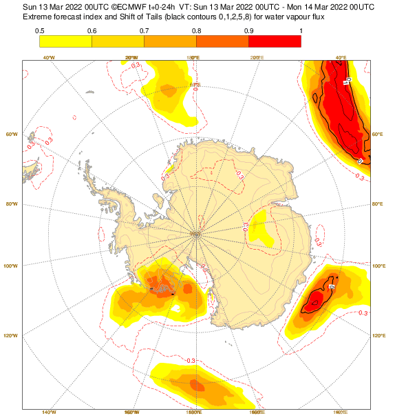 Cette ondulation très importante du courant jet et sa vitesse importante ont ainsi formé une "rivière atmosphérique", c'est à dire un couloir au sein duquel une masse d'air chargée en humidité circule. Cette rivière atmosphérique a gagné le sud-est de l'Antarctique en provenance d'Australie, amenant jusqu'aux régions polaires un air humide & doux venu des latitudes moyennes ! Sur l'animation ci-dessous, la couleur rouge indique un contenu en vapeur d'eau dans l'atmosphère atteignant des niveaux records.