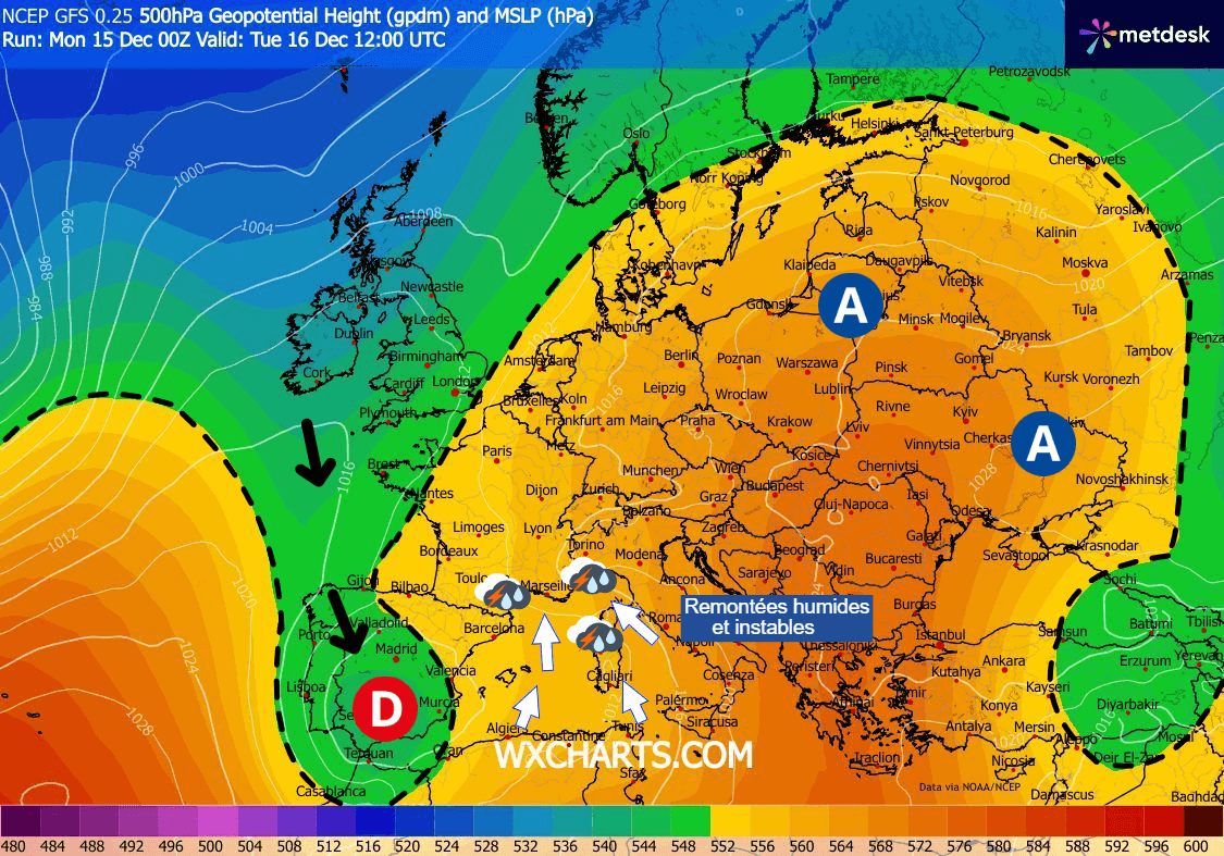 Alors qu'un temps calme et à nouveau doux pour la période persiste sur une large partie de la France, la situation devient plus agitée sur le sud-est du pays. En effet, une goutte froide s'isole sur la péninsule ibérique en ce début de semaine, induisant une bascule du flux au sud/sud-est sur nos littoraux méditerranéens et ainsi la remontée d'air humide et instable vers ces régions.
