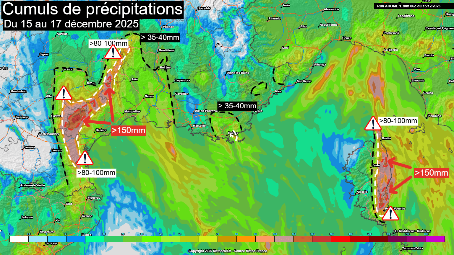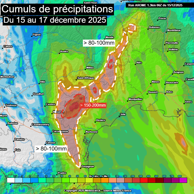 Du côté du Languedoc-Roussillon, les cumuls pourront dépasser les 80 à 100mm entre les reliefs des Pyrénées-Orientales, l'intérieur de l'Aude et l'intérieur de l'Hérault. C'est néanmoins du côté des Cévennes que les cumuls les plus importants seront attendus avec des pointes à plus de 150-200mm sur le nord de l'Hérault et le nord-ouest du Gard d'ici mercredi matin.