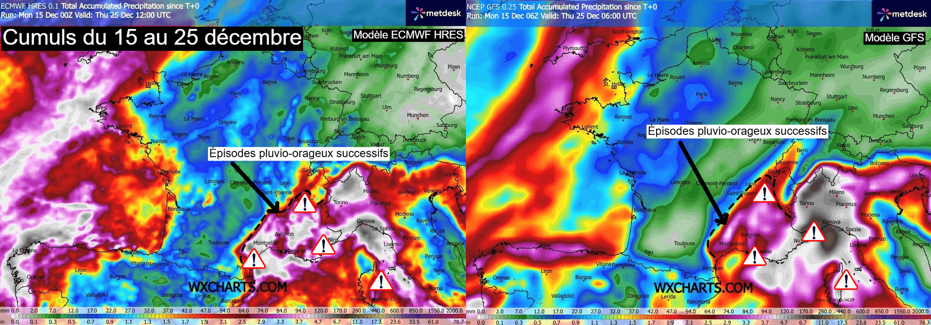 Cumuls de précipitations attendus sur la France jusqu'au 25 décembre 2025 – Modèle GFS et ECMWF via WX CHARTS