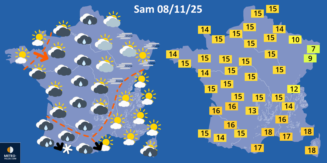 La météo de ce samedi 8 novembre 2025 s'annonce gris du sud-ouest au nord avec un faible apportant de faibles pluies, de plus en plus espacées au fil des heures. Elles resteront régulières sur les départements pyrénéens avec des chutes de neige au dessus de 1800 mètres. Notons que les nuages bas seront sans doute tenaces du val de Saône à la plaine d'Alsace. Toutefois, le sud-est tirera son épingle du jeu avec le retour d'un soleil dominant. De belles éclaircies se développeront aussi sur la Bretagne et la Manche. Il fera plutôt doux pour la saison avec 14 à 16°C en moyenne et 17 à 18°C en Méditerranée. Sous les nuages bas tenaces alsaciens, on prévoit seulement 7 à 9°C.