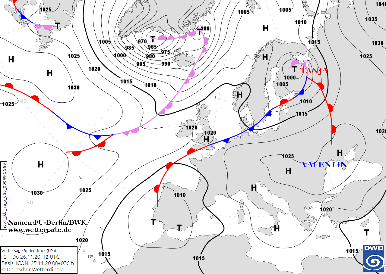 Noms des dépressions et anticyclones prévus pour jeudi 26 novembre 2020 à midi (Berlin)