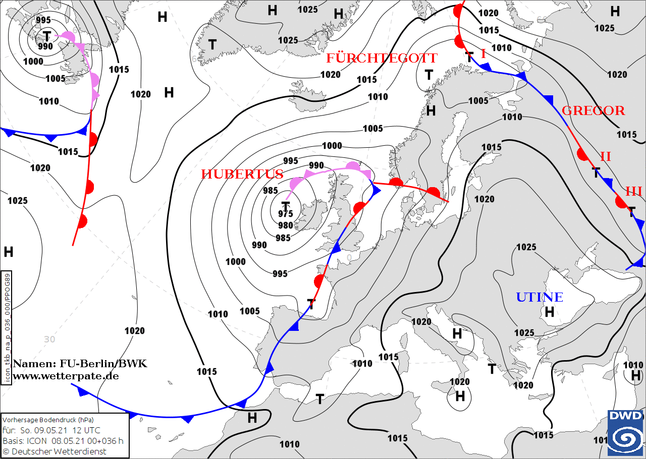Noms des dépressions et anticyclones prévus pour dimanche 9 mai 2021 à midi (Berlin)