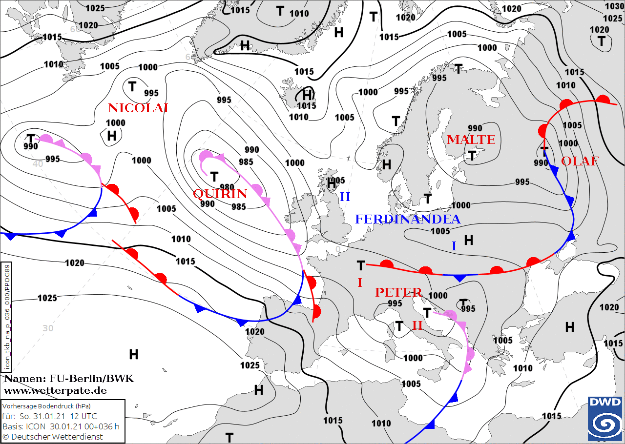 Noms des dépressions et anticyclones prévus pour dimanche 31 janvier 2021 à midi (Berlin)