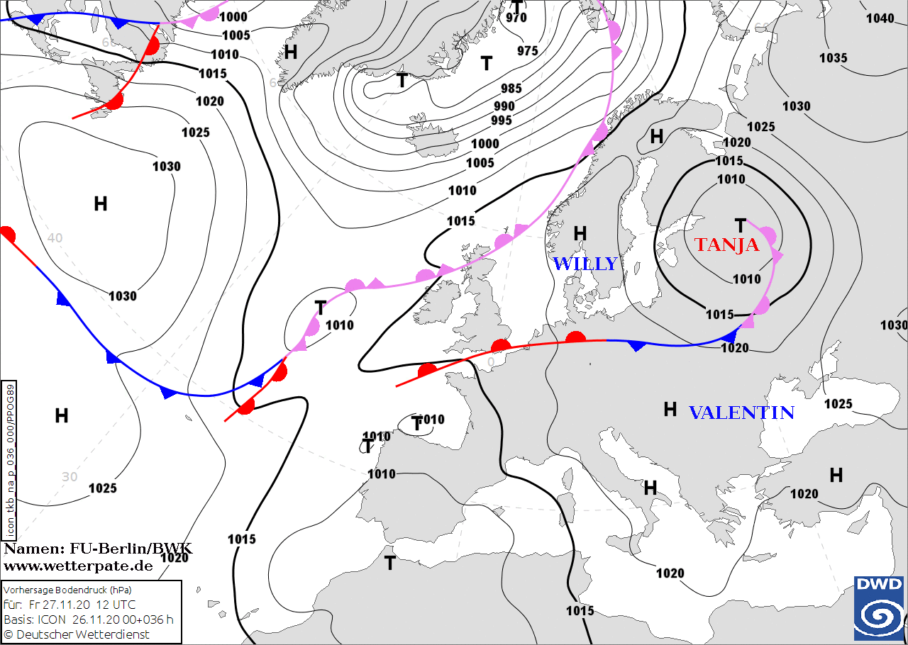 Noms des dépressions et anticyclones prévus pour vendredi 27 novembre 2020 à midi (Berlin)
