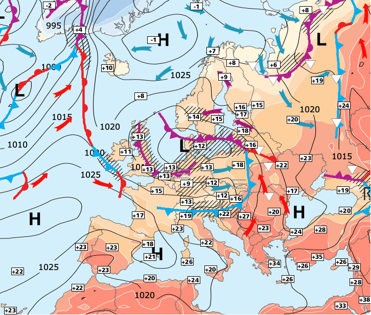 Noms des dépressions et anticyclones prévus pour mercredi 26 mai 2021 à midi (Berlin)