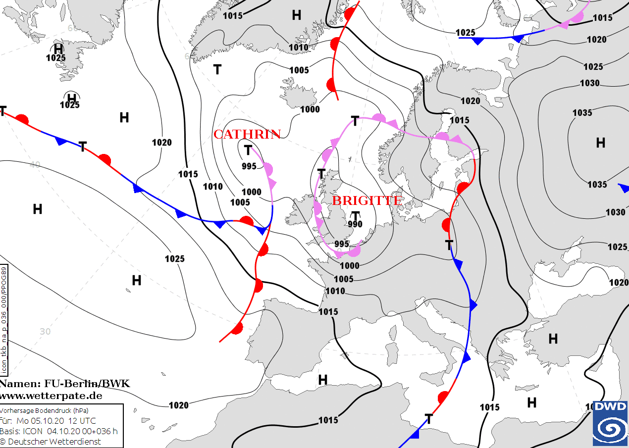 Noms des dépressions et anticyclones prévus pour lundi 5 octobre 2020 à midi (Berlin)