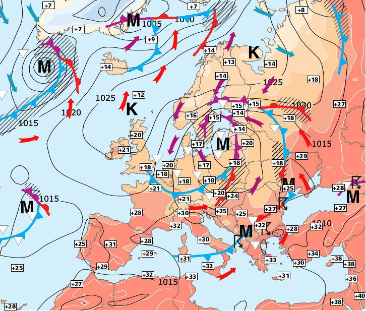 + À partir de mardi (et surtout mercredi), la dépression polonaise perdra du terrain face à l’air chaud et instable d’Espagne qui commencera à remonter vers le nord.