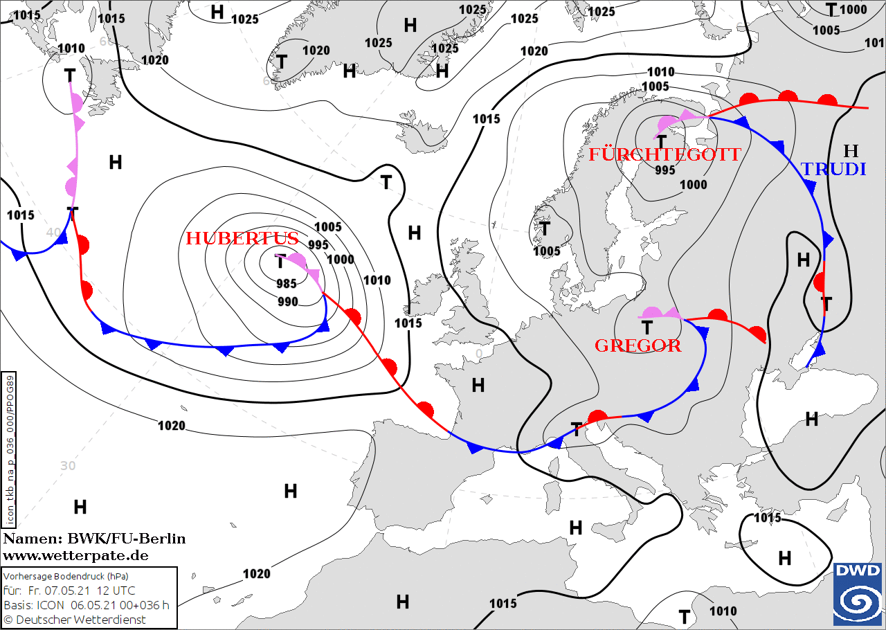 Noms des dépressions et anticyclones prévus pour vendredi 7 mai 2021 à midi (Berlin)