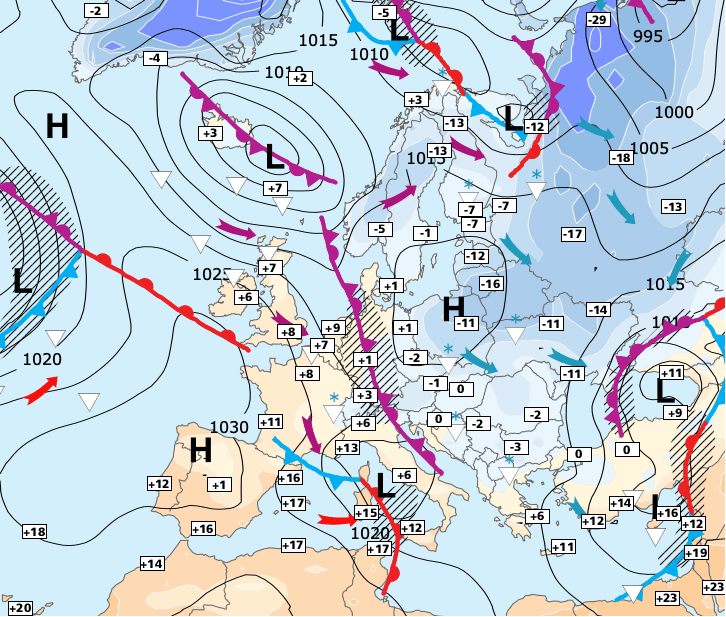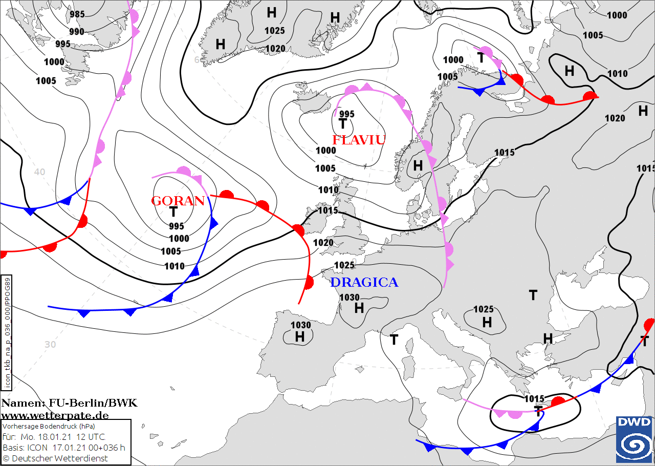 Noms des dépressions et anticyclones prévus pour lundi 18 janvier 2021 à midi (Berlin)