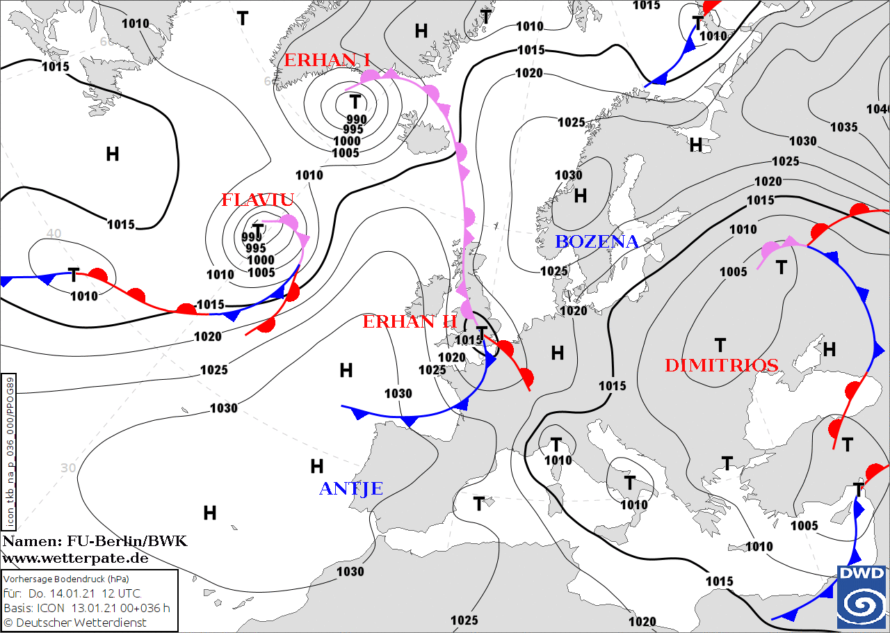 Noms des dépressions et anticyclones prévus pour jeudi 14 janvier 2021 à midi (Berlin)