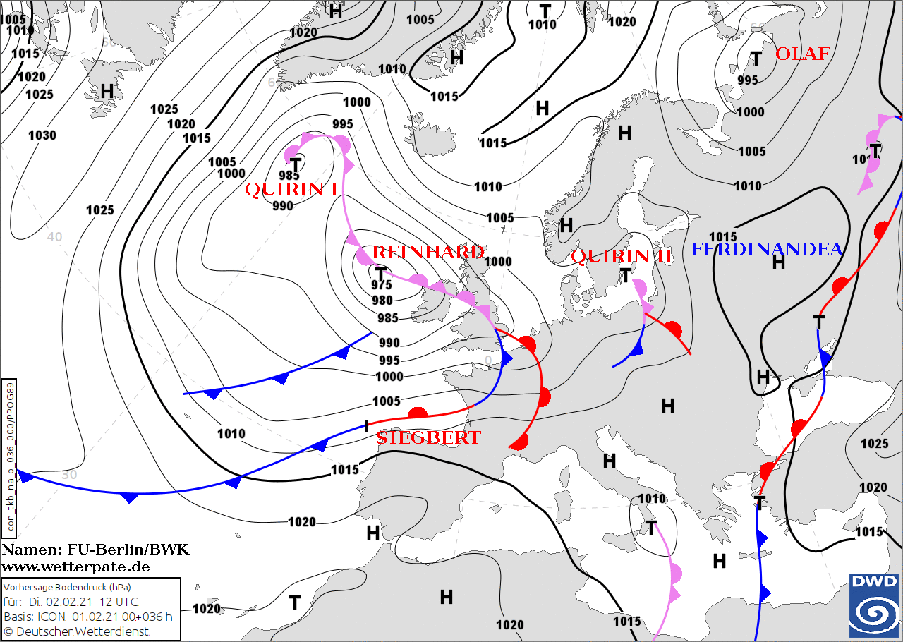 Noms des dépressions et anticyclones prévus pour mardi 2 février 2021 à midi (Berlin)