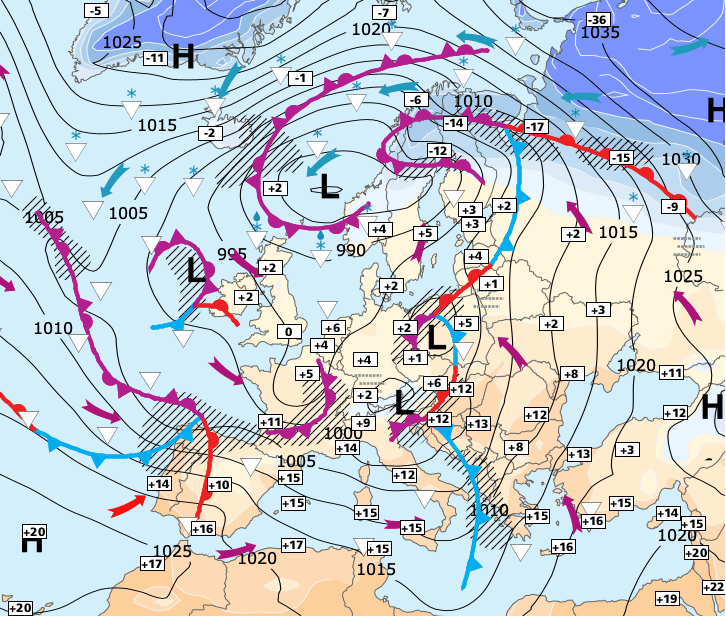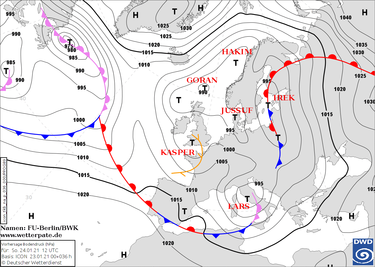 Noms des dépressions et anticyclones prévus pour dimanche 24 janvier 2021 à midi (Berlin)