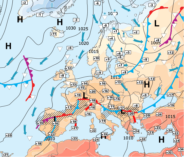+ La France va progressivement se trouver en limite d'un conflit entre l’air chaud qui remonte en Méditerranée et l’air froid qui descend de Scandinavie.