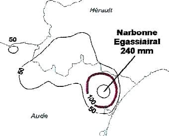 Le 5 août 1989 , il tombe 240mm de pluie en quelques heures à Narbonne, sous un orage très localisé. La nuit tombe alors que des nuages bas recouvre le littoral. Le spectacle est vraiment impressionnant.